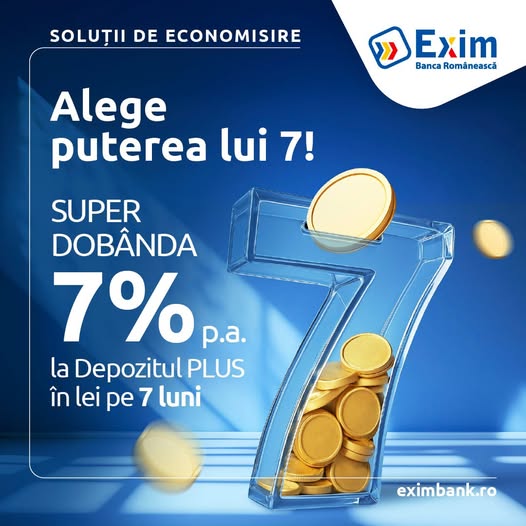 Alege puterea lui 7! În luna a 7-a ai superdobândă 7% la Depozitul PLUS în lei pe 7 luni de la Exim Banca Românească