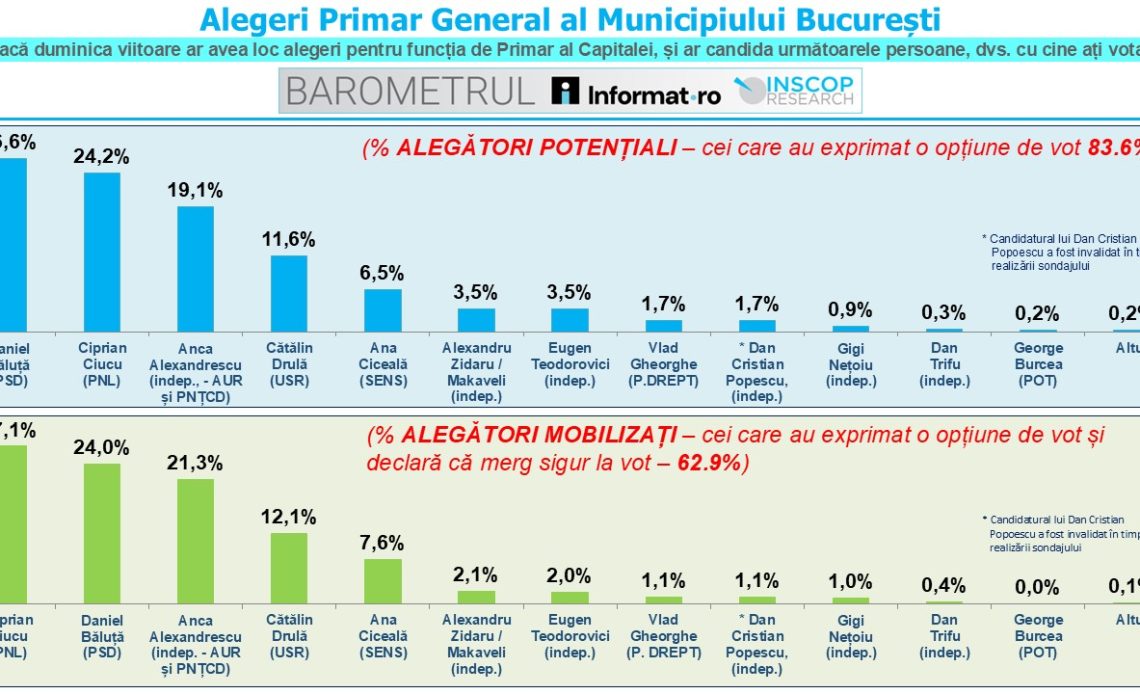Un sondaj Informat.ro – INSCOP Research arată intențiile de vot la alegerile pentru Primăria Capitalei, unde Daniel Băluță (PSD) este pe primul loc, urmat de Ciprian Ciucu (PNL) și Anca Alexandrescu (AUR-PNȚCD).