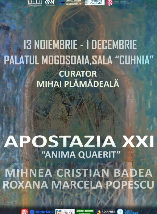 Sâmbătă, 15 noiembrie 2025, ora 12, va avea loc la Centrul Cultural Palatele Brâncoveneşt, Mogoşoaia, Sala Cuhnia, vernisajul expoziţiei de pictură şi grafică, “Apostazia XXI / Anima Quaerit”, semnată de Mihnea Cristian Badea şi Roxana Marcela Popescu. Expoziţia va fi deschisă în perioada 11 noiembrie – 3 decembrie 2025.
