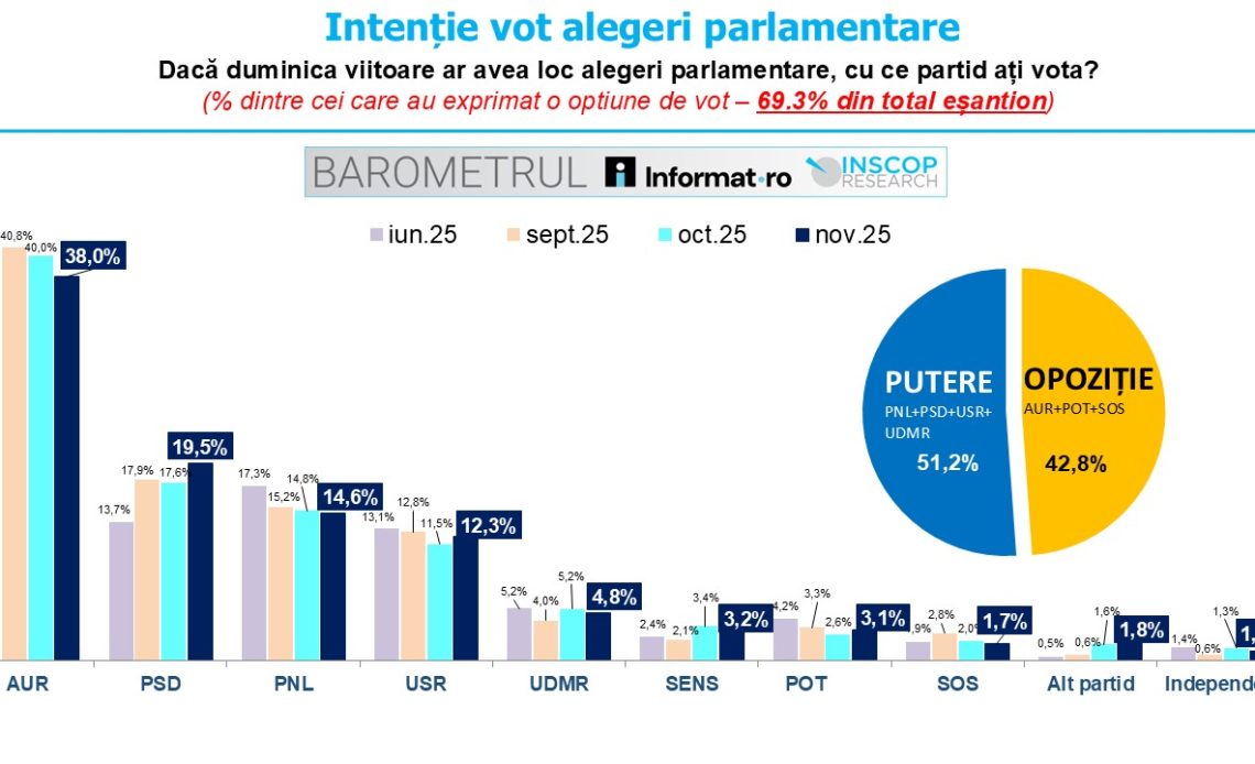 „Pentru prima dată după alegerile prezidențiale din mai 2025, AUR coboară sub pragul de 40%, însă rămâne la un scor dublu comparativ cu următorul clasat, Partidul Social Democrat, aflat în ușoară creștere. PNL, USR și UDMR se mențin la un nivel constant, comparativ cu lunile anterioare. Partidele care formează coaliția guvernamentală cumulează 51% din intenția de vot, în timp ce partidele din opoziție parlamentară aproximativ 43%”, spune Remus Ștefureac – director INSCOP Research.