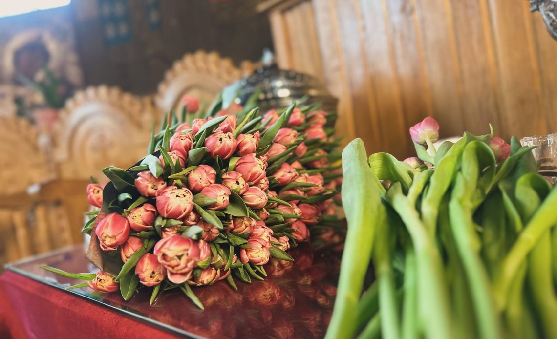 Slujba a fost oficiată de părintele paroh Alexandru Ionită, care ne-a și îndrumat ce daruri să pregătim pentru cei prezenți și să împodobim biserica, încă de ieri, cu sute de lalele.