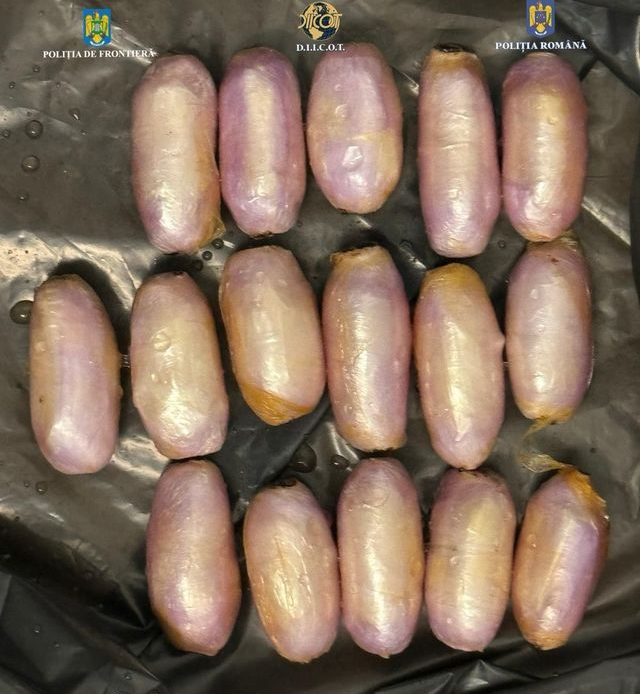 Un cetăţean brazilian în vârstă de 26 de ani a fost prins, în urmă cu trei zile, de către poliţişti, pe Aeroportul Henri Coandă, din Otopeni, având asupra sa, fixate pe picioare cu bandă adezivă, două pachete ce conţineau aproximativ o jumătate de kilogram de cocaină, porţionată în 78 de caşete. De asemenea, la controlul cu un scanner cu raze X poliţiştii au văzut, în stomacul bărbatului, „formaţiuni neobişnuite” pentru anatomia umană. Dus la spital, brazilianul a eliminat 62 de caşete conţinând în jur de 350 de grame de substanţă pulverulentă, în curs de expertizare, susceptibilă a fi cocaină. Presupusul traficant a fost arestat preventiv.