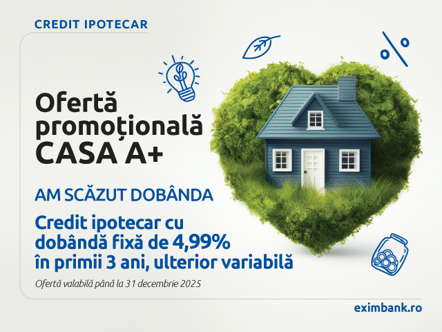 Exim Banca Românească a lansat oferta promoțională Casa A+, soluție de finanțare ipotecară cu dobândă fixă de 4,99% în primii 3 ani, ulterior variabilă, care încurajează investițiile în locuințe eficiente energetic oferind totodată protecție împotriva fluctuațiilor de dobândă.