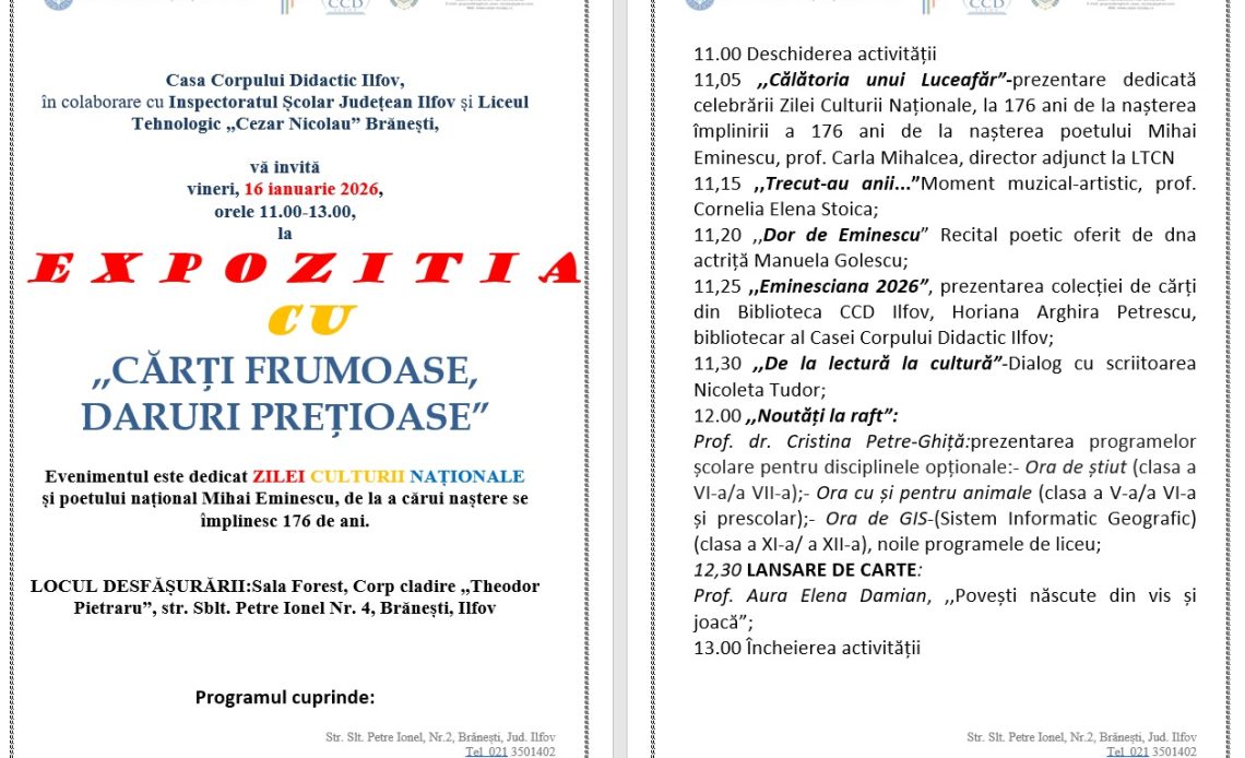 Expoziția „Cărți frumoase, daruri prețioase”, organizată cu prilejul Zilei Culturii Naționale și al aniversării a 176 de ani de la nașterea poetului Mihai Eminescu. Evenimentul propune un demers cultural complex, ce îmbină armonios cartea, muzica, poezia și dialogul artistic.