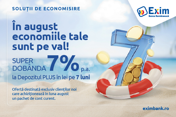 Exim Banca Românească prelungește până la finalul lunii august oferta unică de economisire care permite persoanelor fizice să-și valorifice economiile cu un randament peste media pieței prin constituirea de depozite la termen, pe 7 luni, cu dobânzi de până la 7,00% pe an.