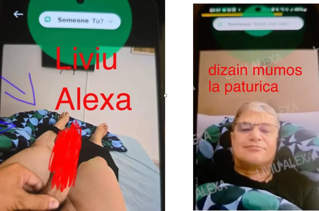 Liviu Alexa: Sunt poze cu pronunțat caracter sexual și dumneavoastră trimiteți o poză din pat da, din locuința dumneavoastră, de pe strada Bună Ziua și sunt câteva detalii care cumva să zicem nu vă ajută dacă vreți să mă refuzați în răspuns pentru că că o să vedeți în articol despre ce e vorba. Obișnuiți des să stați pe genul ăsta de aplicații?