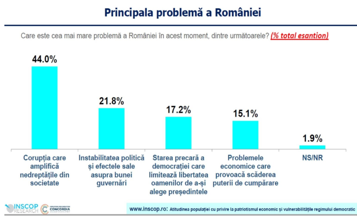 Întrebați care este la acest moment cea mai mare problemă a României, 44% dintre respondenți au ales varianta ”corupția care amplifică nedreptățile din societate”, 21,8% ”instabilitatea politică și efectele sale asupra bunei guvernări”, 17,2% ”starea precară a democrației care limitează libertatea oamenilor de a-și alege președintele”, iar 15,1% ”problemele economice care provoacă scăderea puterii de cumpărare”.