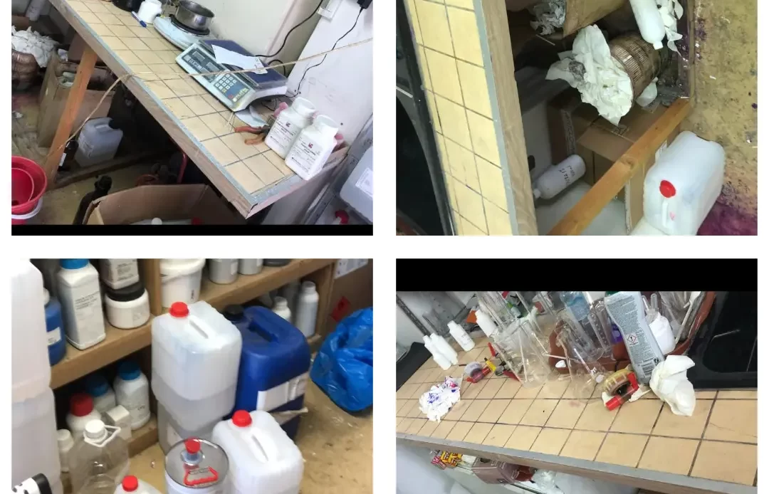 La descinderile din 2023, anchetatorii au găsit un peisaj de coșmar: 1.233 de recipiente cu produse chimice și farmaceutice expirate, fără etichete sau cu termene de valabilitate mâzgălite manual, depozitate claie peste grămadă.