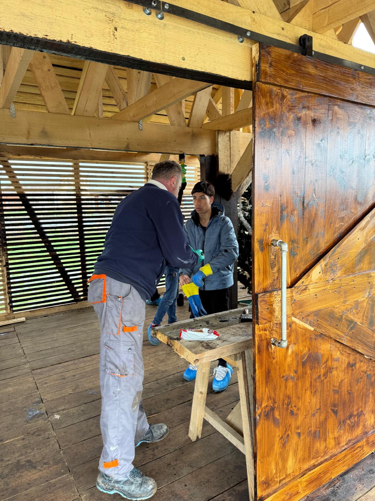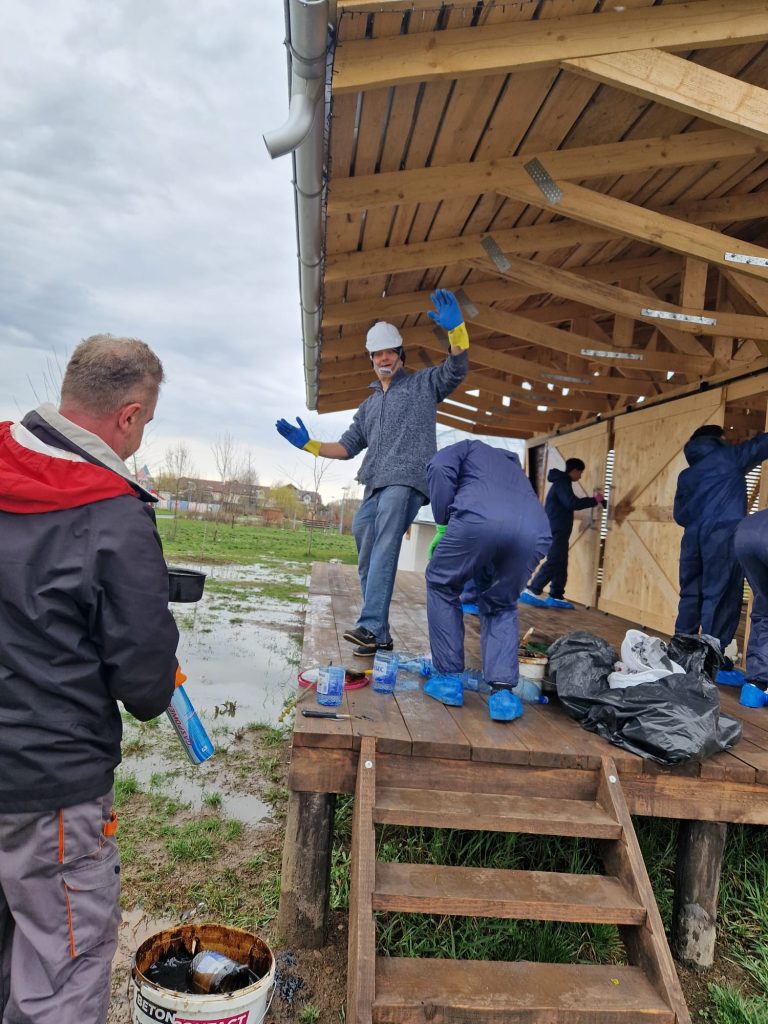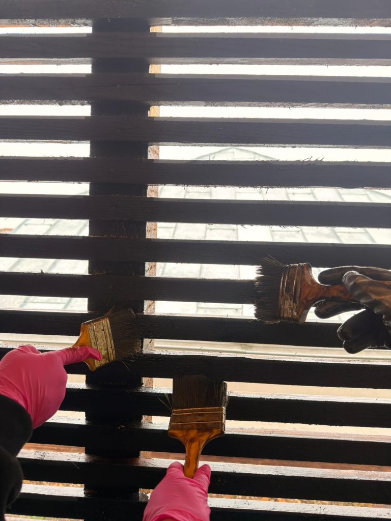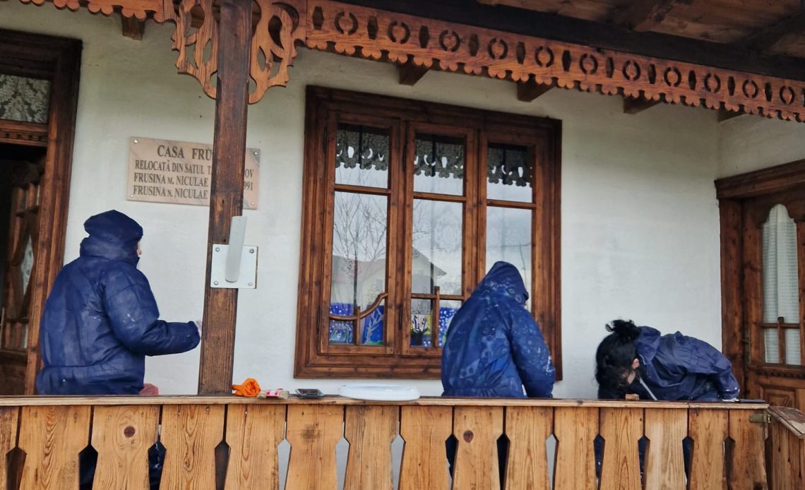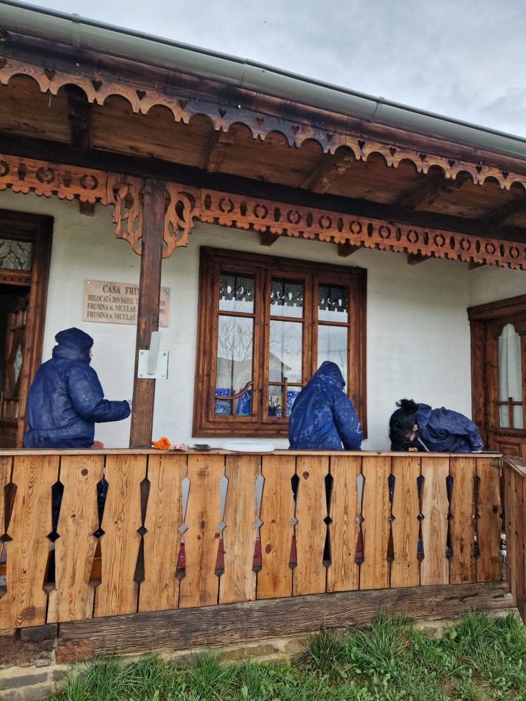 În acest spirit, am reconstruit 𝐡𝐚𝐦𝐛𝐚𝐫𝐮𝐥 𝐜𝐚𝐬𝐞𝐢 𝐅𝐫𝐮𝐬𝐢𝐧𝐚 după modelul original, proiect finalizat în toamna trecută. În această primăvară, am continuat lucrările prin aplicarea unei emulsii speciale, pe bază de pigmenți organici, ceară de albine, bitum, gaz lampant și ulei mineral, menită să protejeze și să conserve lemnul în timp.