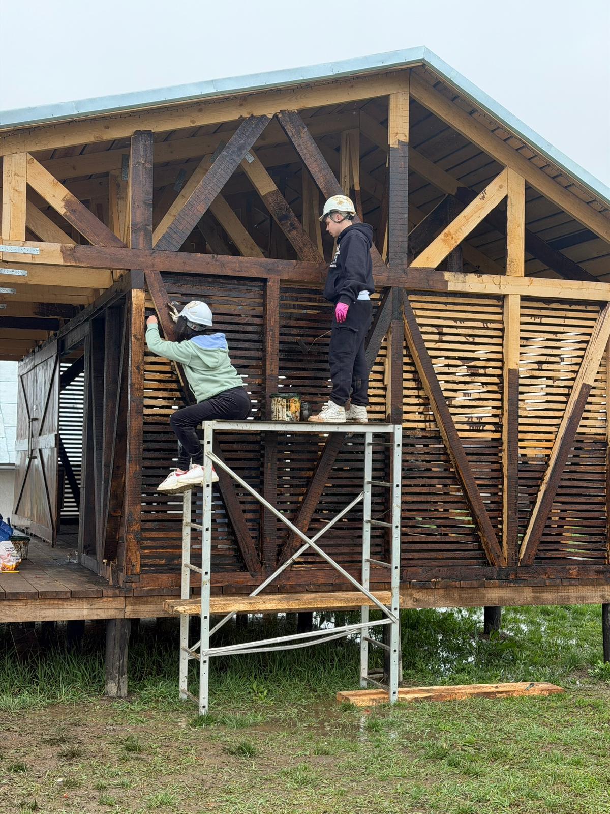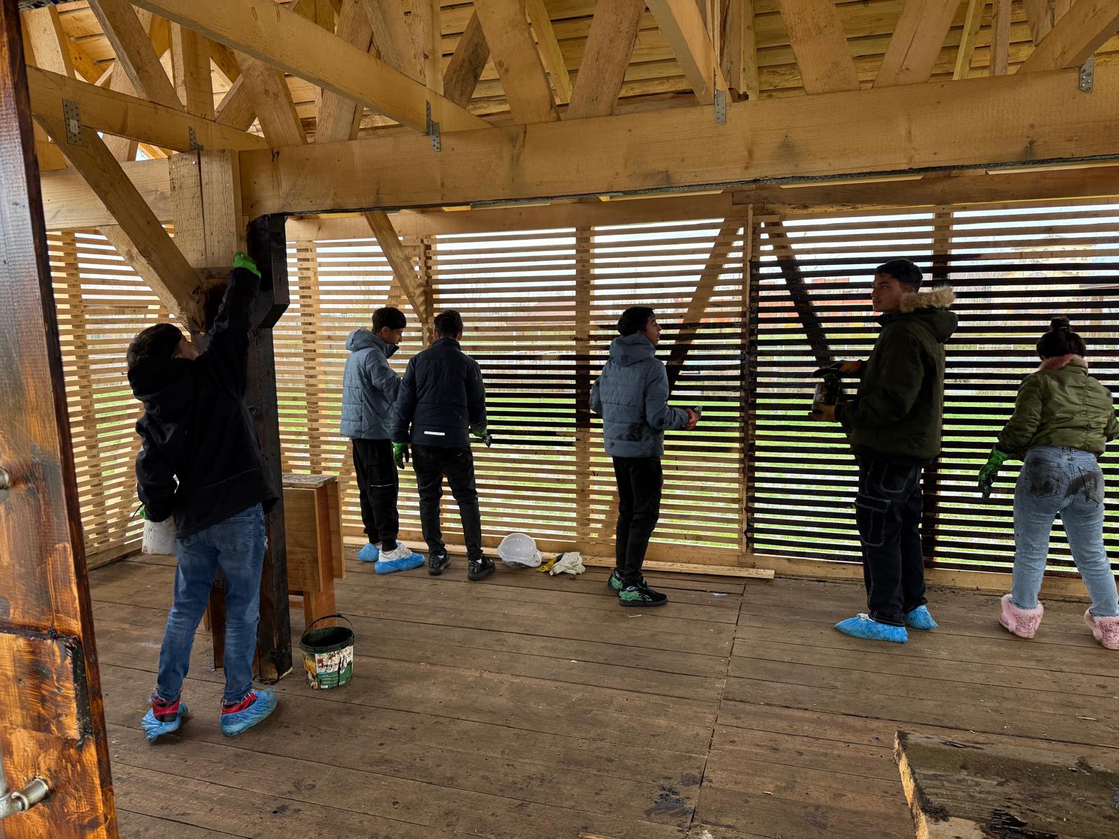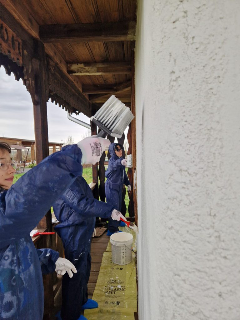 În acest spirit, am reconstruit 𝐡𝐚𝐦𝐛𝐚𝐫𝐮𝐥 𝐜𝐚𝐬𝐞𝐢 𝐅𝐫𝐮𝐬𝐢𝐧𝐚 după modelul original, proiect finalizat în toamna trecută. În această primăvară, am continuat lucrările prin aplicarea unei emulsii speciale, pe bază de pigmenți organici, ceară de albine, bitum, gaz lampant și ulei mineral, menită să protejeze și să conserve lemnul în timp.