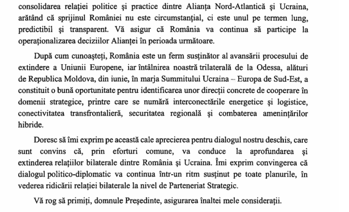 “Ucraina apreciază cu adevărat sprijinul și livrările vitale ale României de echipament defensiv care ne ajută să protejăm orașele și comunitățile noastre. Împreună facem eforturi pentru a ajunge la o pace durabilă”, a mai scris Volodimir Zelenski, care a publicat și scrisoarea transmisă de omologul de la București.